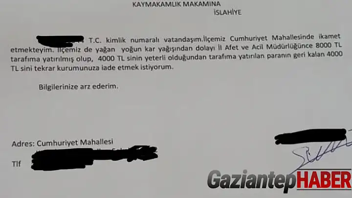 İslahiye ilçesi Cumhuriyet Mahallesi'nde yaşayan Mustafa Özbal ve oğlu Şeyh Şamil Özbal'ın kaldığı evin çatısı, ocak ayında meydana gelen son 54 yılın en şiddetli kar yağışında hasar gördü. Kolluk kuvvetleri ve AFAD ekiplerinin yaptığı hasar tespit çalışmalarının ardından evde yaklaşık 8 bin TL'lik hasar tespit edildi. Hasarın giderilmesi için Özbal ailesine 8 bin lira yardım yapılırken, aile yaklaşık 4 bin TL'lik masraf ile hasarı giderdi. Çatının onarılmasının ardından Mustafa Özbal ve oğlu, devletin verdiği 4 bin TL'yi iade etme kararı aldı. Duyarlı baba ve oğlu, İslahiye Kaymakamlığına verdikleri ''İlçemiz Cumhuriyet Mahallesi'nde ikamet etmekteyim. Ülkemizde yağan yoğun kar yağışından dolayı İl Afet ve Acil Müdürlüğünce 8 bin TL tarafıma yatırılmış olup, 4 bin TL'sinin yeterli olduğundan tarafıma yatırılan paranın geri kalan 4 bin TL'sini tekrar kurumunuza iade etmek istiyorum'' yazılı dilekçe ile parayı geri iade etti.