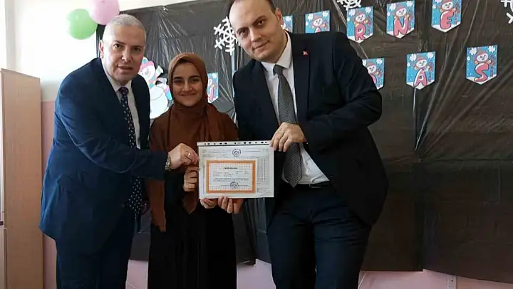 Kaymakam İşçimen öğrencilerin karnelerini dağıtarak hatıra fotoğrafı çektirdi.