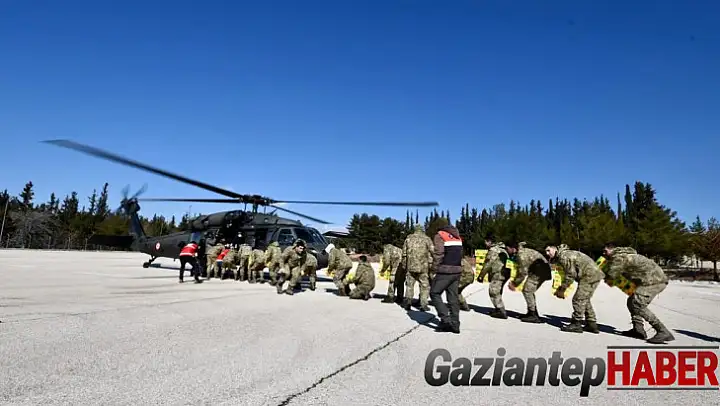 Kahramanmaraş merkezli 7.7 ve 7.6 büyüklüğündeki depremlerden etkilenen Gaziantep'in Nurdağı ve İslahiye ilçelerinin dağlık kesiminde bulunan köylere askeri helikopterlerle yardım malzemeleri ulaştırıldı.