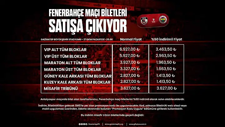 Gaziantep Futbol Kulübü, Trendyol Süper Lig'in 10. haftasında 27 Ekim Pazartesi günü saat 20.00'da Fenerbahçe'yi konuk edecek. Bu mücadelenin biletleri bugün 14.00 itibariyle satışa çıkacak. Gaziantep Büyükşehir Stadyumu'nda oynanacak zorlu karşılaşmanın bilet fiyatları ev sahibi takım için 2 bin 827 TL ile 6 bin 927 TL arasında belirlenirken, misafir tribün bilet fiyatları ise 3 bin 627 TL oldu.