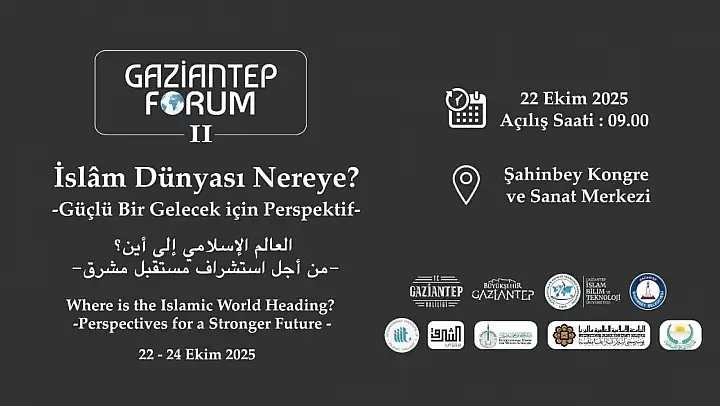 Gaziantep İslam Bilim ve Teknoloji Üniversitesi tarafından düzenlenen Gaziantep Forum II, bu yıl 'İslm Dünyası Nereye? - Güçlü Bir Gelecek için Perspektif' temasıyla gerçekleştirilecek. İslm dünyasının mevcut meseleleri, gelecek vizyonu ve küresel ölçekteki rolünün ele alınacağı Gaziantep Forum'a dünyanın dört bir yanından akademisyenler, araştırmacılar, sivil toplum kuruluşları ve ilgili paydaşlar katılım sağlayacak. Forum 22-24 Ekim 2025'te Şahinbey Kongre ve Sanat Merkezi'nde yapılacak.