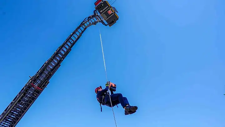 Etkinliğin ilk bölümünde, kurtarma ekibine bağlı personel yangın merdivenine kurulan özel düzenekle ip yardımıyla hızlı bir şekilde aşağı indi. İzleyenlere gerçek bir tatbikat havası yaşatan iniş sırasında personelin gösterdiği çeviklik ve disiplin dikkat çekti. Bu antrenman, kurtarma operasyonlarındaki hazırlık ve reflekslerin ne kadar önemli olduğunu bir kez daha ortaya koydu.