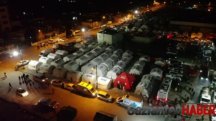 Depremin büyük yıkıma neden olduğu Gaziantep'in Nurdağı ilçesinde depremzedeler geceyi kurulan çadır kentte geçirmeye başladı.