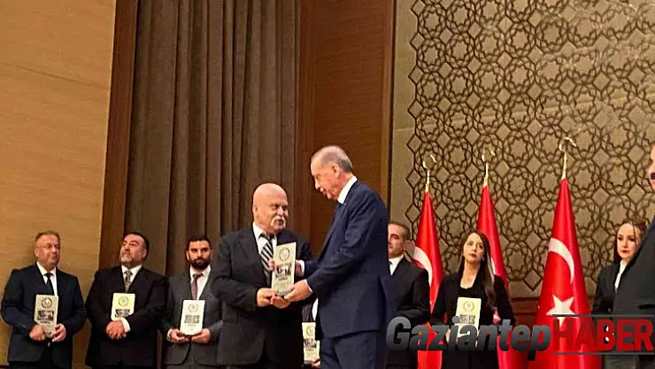 Gaziantep Olay Medya Grubu Yönetim Kurulu Başkanı Mehmet Erol Maraş, yılın köşe yazarı ödülünü Cumhurbaşkanı Erdoğan'dan aldı.