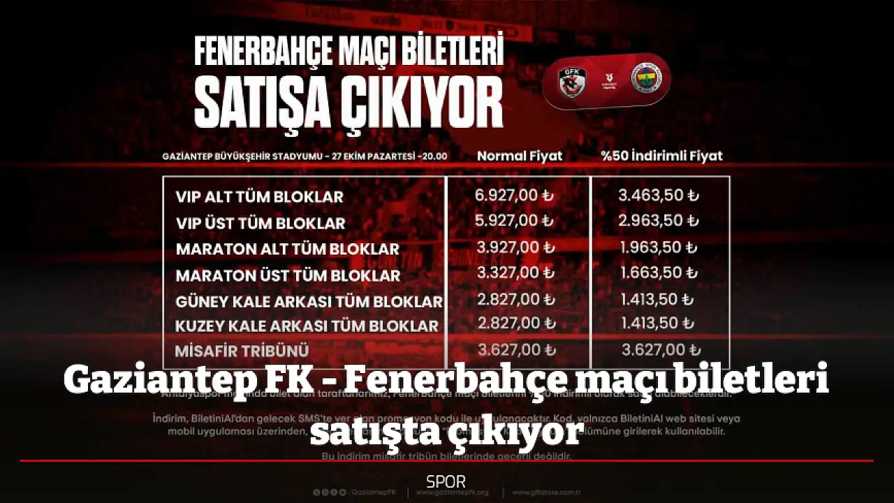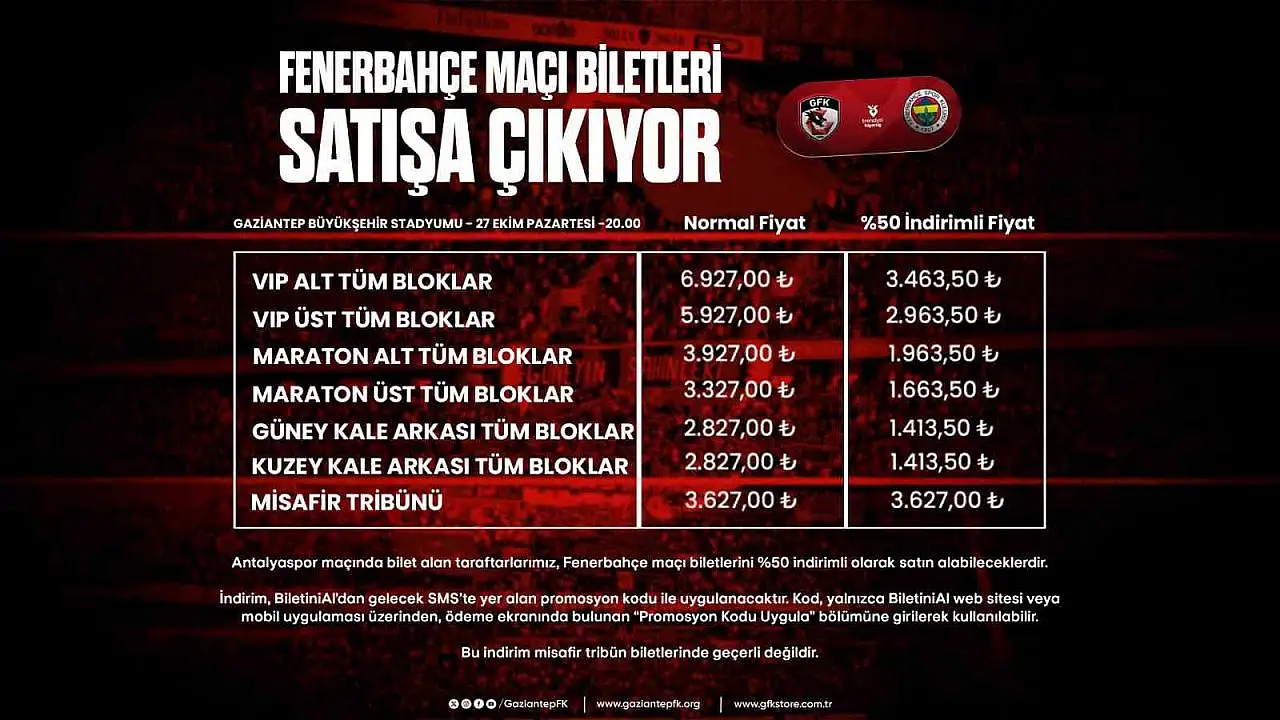 Gaziantep Futbol Kulübü'nün, Süper Lig'in 10. haftasında sahasında Fenerbahçe ile oynayacağı maçın biletleri bugün satışa çıkacak.