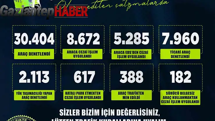 Gaziantep’te birçok noktasında gerçekleştirilen trafik denetlemelerinde eksiği görülen araç ve sürücülerine cezai işlem uygulanırken, sürücüler, trafik kurallarına uymaları konusunda uyarıldı. Gerçekleştirilen denetimler sonucu; 7 bin 960 ticari araç ve 2 bin 113 yük taşımacılığı yapmak üzere 30 bin 404 araç denetlenmiştir.