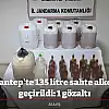 Gaziantep'te jandarmanın sahte alkol imal ve ticareti yaptığı tespit edilen şahsa yönelik operasyonunda 135 litre sahte alkol ile 65 litre etil alkol ele geçirildi.