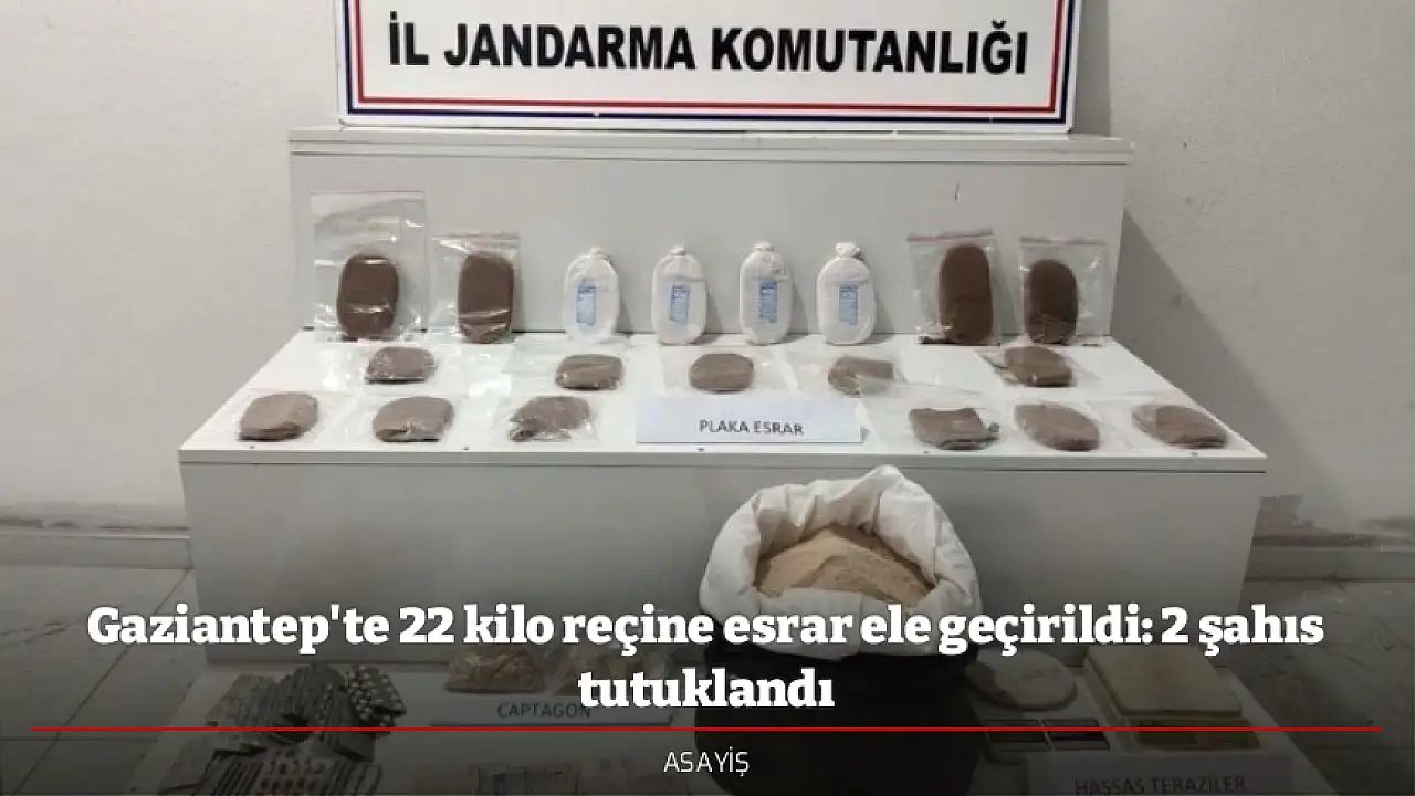 Gaziantep İl Jandarma Komutanlığı Narkotik Şube Müdürlüğü, İstihbarat Şube Müdürlüğü ve Şehitkâmil İlçe Jandarma Komutanlığı ekipleri ve Cumhuriyet Başsavcılığı koordinesinde uyuşturucu ve uyarıcı madde ile mücadeleye yönelik operasyon yapıldı. Operasyon çerçevesinde, uyuşturucu ticareti yaptığı tespit edilen E.E.N. isimli şahıs Şahinbey ilçesinde, A.A. isimli şahıs ise Şehitkâmil ilçesinde yakalandı. Şahısların işyerinde ve ikametinde yapılan eş zamanlı aramalarda 22 kilogram reçine esrar maddesi, 125 bin adet captagon hap imal edilebilecek 22 kilogram hammadde, 7 bin 500 adet captagon hap, 2 bin 938 adet sentetik hap, 2 adet hassas terazi ile 6 bin 430 TL suçtan elde edilen para ele geçirildi.