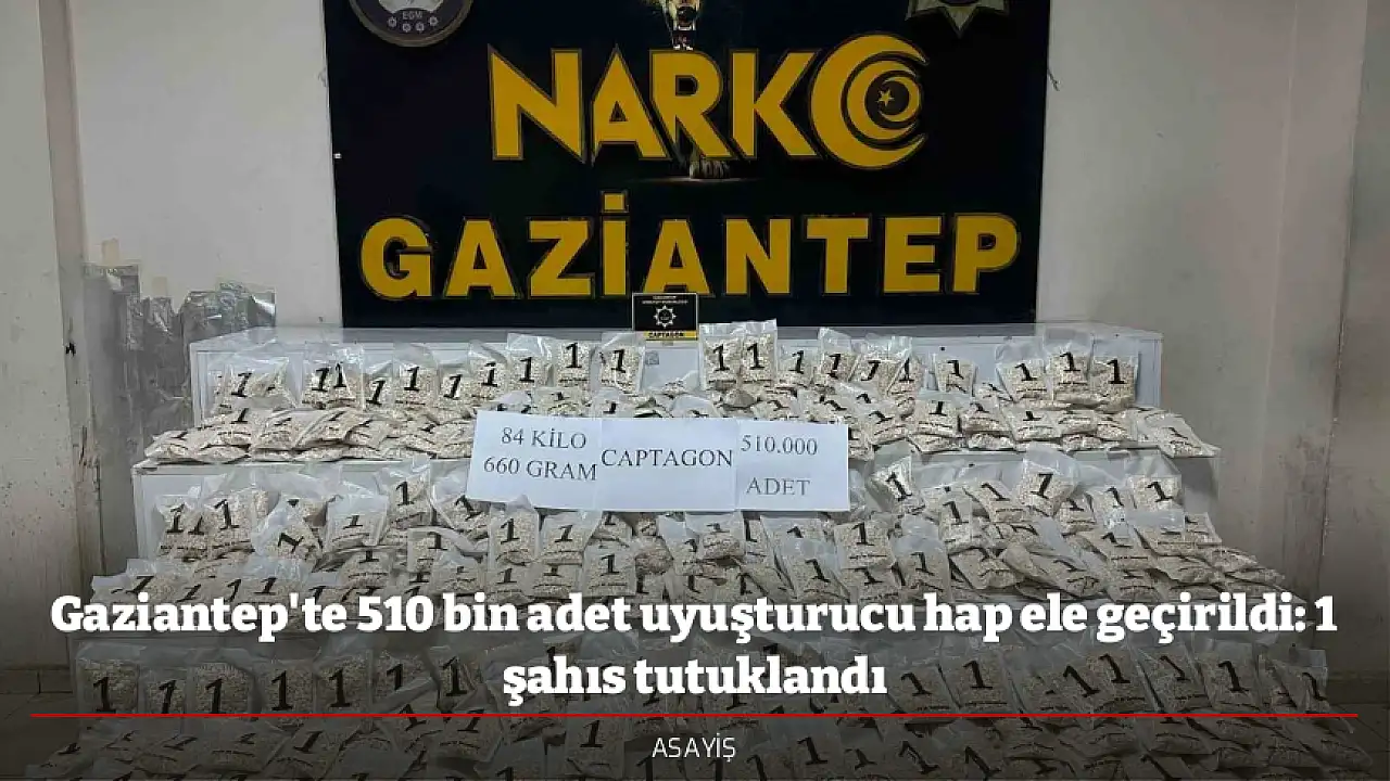 Gaziantep Emniyet Müdürlüğü Narkotik Suçlarla Mücadele Şube Müdürlüğü ekipleri ve Cumhuriyet Başsavcılığı koordinesinde narkotik operasyonu yapıldı. Operasyon çerçevesinde, kent çıkışında yapılan yol kontrolünde şüpheli bir araç durduruldu. Araçta, hassas burunlu dedektör köpek destekli aramalarda çuvallara zulalanmış halde 510 bin adet uyuşturucu captagon hap ele geçirildi. Olayla ilgili 1 şüpheli şahıs gözaltına alındı.