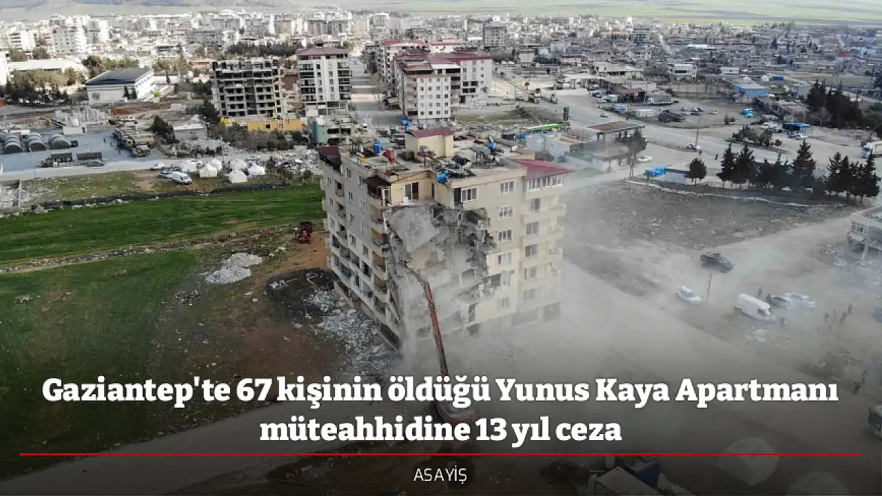 Gaziantep'in Nurdağı ilçesinde 6 Şubat depremlerinde yıkılan Yunus Kaya Apartmanı ile ilgili davada müteahhit Yunus Kaya'ya 13 yıl 9 ay hapis cezası verildi.