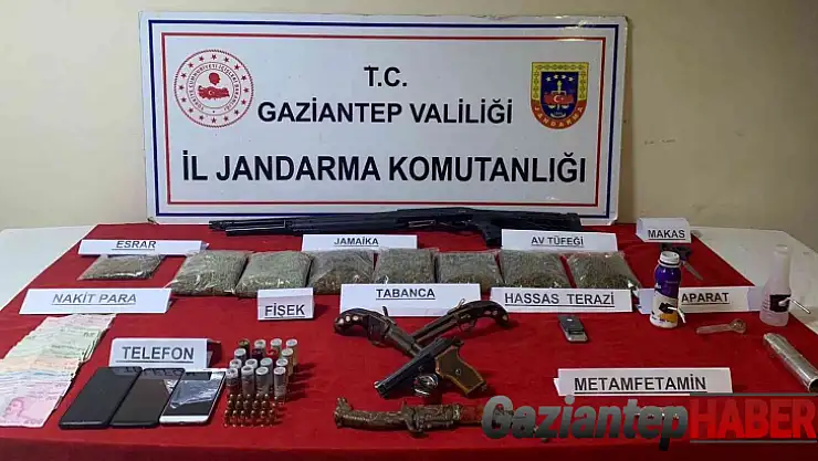 Gaziantep İl Jandarma Komutanlığı ekipleri, 09-15 Mart tarihleri arasında kaçakçılık olayları ve uyuşturucuyla mücadele kapsamında çok sayıda operasyon gerçekleştirdi. Ekipler operasyon sonucu; 4 kilo 254 gram jamaika, 601 gram metamfetamin, 244 gram kubar esrar, 5 gram kokain, 16 adet uyuşturucu kullanma aparatı, 3 adet tabanca, 1 adet av tüfeği, 31 adet mühimmat, 1 adet kama, 2 adet hassas terazi, 13 bin 465 Türk Lirası ele geçirdi. Olaylarla ilgili 39 şahıs hakkında yasal işlem başlatılırken Gaziantep İl Jandarma Komutanlığı, halkın huzur ve güvenliği için çalışmaların artarak devam edeceğini vurguladı.