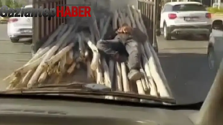 Gaziantep'te bir kişi, trafikte seyir halinde olan kamyonetin kasasındaki tahtaların üzerinde uyuyakaldı. Cep telefonu kamerasına yansıyan o anlar pes dedirtti.