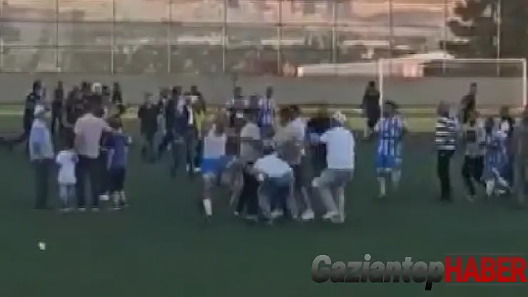 Gaziantep'te düzenlenen Barak Bahar Turnuvası'nın yarı final maçının bitimiyle futbolcular birbirine girdi. Adeta ringe dönen sahadaki olayları görüntüleyen bir kişinin futbolculardan meydan dayağı yemesi kameraya yansıdı.