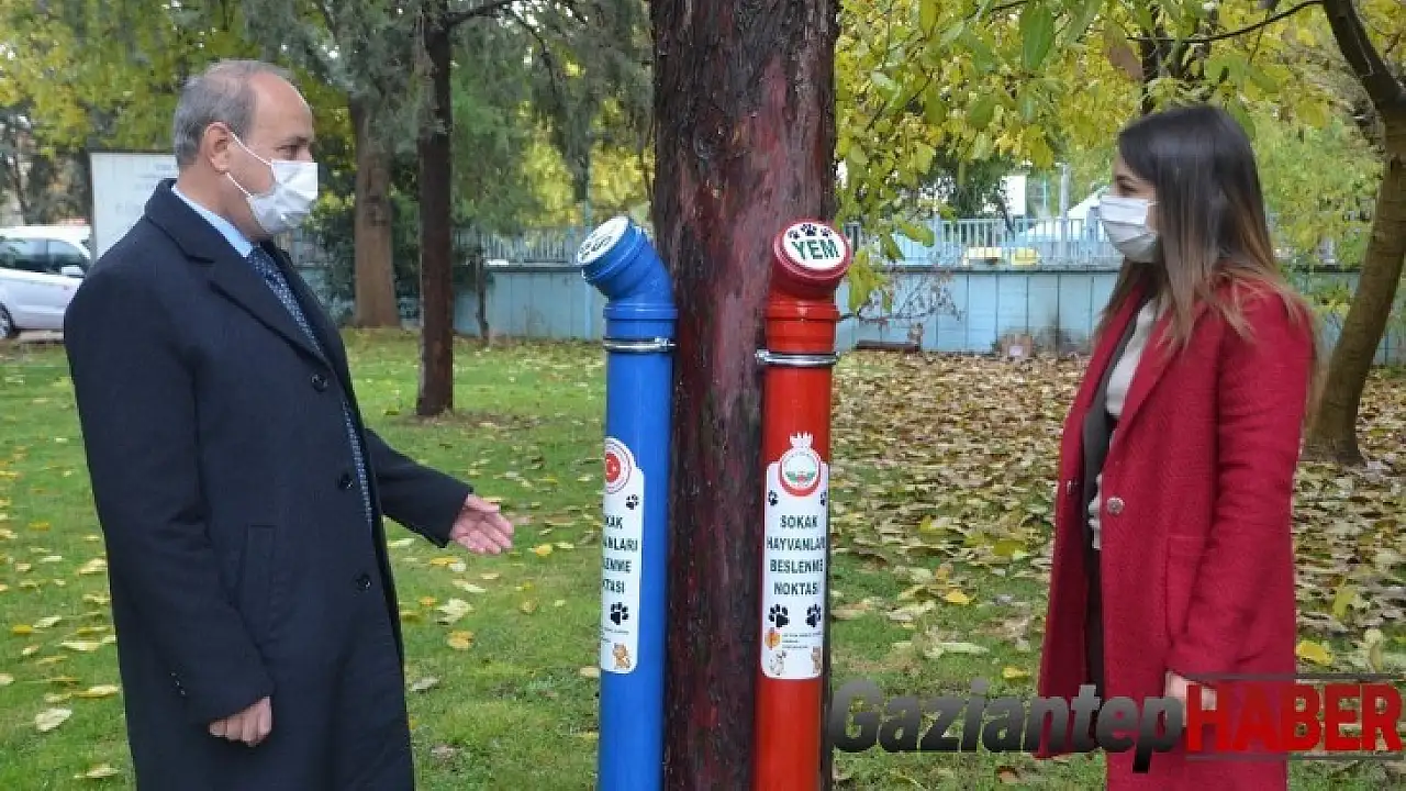 Gaziantep'in Oğuzeli ilçesinde Kaymakamlık ve Belediye iş birliği ile sokak hayvanları için belirlenen uygun yerlere atıl su borularından yapılan yemlik ve suluk yerleştirildi.
