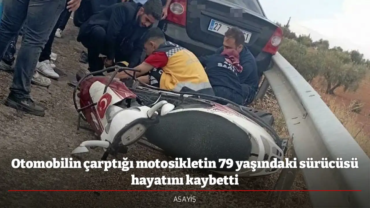 Gaziantep'in Nizip ilçesinde yağış nedeniyle kayganlaşan yolda kontrolden çıkan otomobilin çarptığı motosikletin 79 yaşındaki sürücüsü hayatını kaybetti.