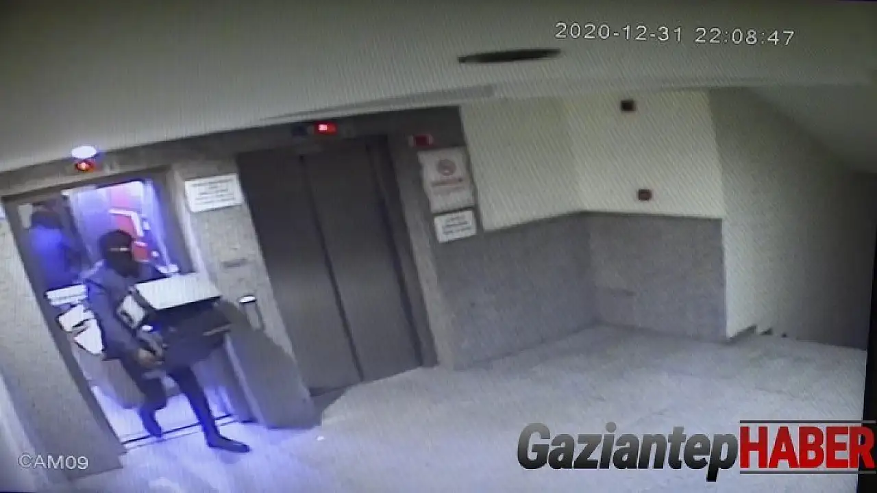 Gaziantep'in Şehitkamil ilçesi Sebahat Göğüş Caddesi üzerindeki Vakıflar İş Merkezi’nin birinci katındaki bir muhasebe ofisine hırsız girdi. Ofisin camını zorlayarak açan hırsız, içeride bulunan bilgisayar kasa ve monitörleri ile sadaka kutusu ve bilgisayar donanımı malzemelerini çaldı. Kasaları ve malzemeleri içerisine koyduğu koliyi asansör yardımıyla binanın giriş katına indiren hırsızın bu anları güvenlik kameralarına yansıdı. Maske ve beresi ile yüzünü gizleyen hırsızın rahat ve sakin tavırları dikkat çekti. Akşam karanlığından da faydalanan hırsız, kayıplara karıştı. Güvenlik kameralarını inceleyen polis, yaptığı operasyon ile şahsı yakalayarak gözaltına aldı. Şahsın, çaldığı malzemeleri ticari taksi ile evine götürdüğü belirlendi.
