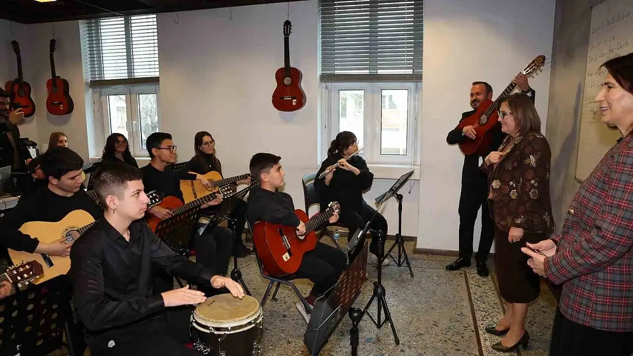 Atölyelerin devam ettiği Kahraman Emmioğlu Kültür ve Sanat Merkezi’nde kursiyerlerle bir araya gelen Başkan Fatma Şahin, piyano, keman ve resim eğitimi alan çocukların çalışmalarını yakından inceleyerek performanslarını izledi.