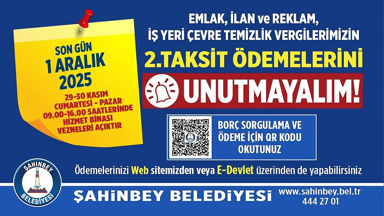 Şahinbey Belediyesi, 2025 yılı Emlak Vergisi, İş Yeri Çevre Temizlik Vergisi ile İlan ve Reklam Vergisi borçlarının ikinci taksit ödemeleri için son tarihin 1 Aralık 2025 Pazartesi olduğunu hatırlattı. Şahinbey Belediye Başkanı Mehmet Tahmazoğlu, vatandaşlara çağrıda bulunarak gecikme cezalarıyla karşılaşılmaması için ödemelerin zamanında yapılması gerektiğini vurguladı.