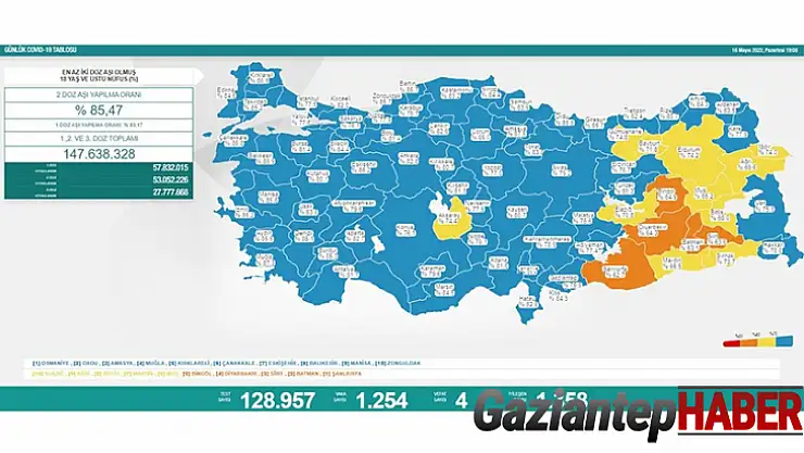 Sağlık Bakanlığı tarafından Türkiye’nin yeni korona virüs tablosu açıklandı. 16 Mayıs’ta açıklanan 24 saatlik verilere göre, bin 254 vaka tespit edildi. Virüs nedeniyle hayatını kaybedenlerin sayısı 4 oldu. Bir günde toplam 128 bin 957 test yapılırken, iyileşen hasta sayısı bin 358 olarak kaydedildi. Sağlık Bakanlığı tarafından açıklanan tabloda, 2 doz aşılama verilerine de yer verildi. En az 2 doz aşı olmuş 18 yaş üzeri nüfusu kapsayan verilere göre Türkiye’de 2. doz aşılama ortalama yüzde 85,47 oldu. 1. doz ortalaması yüzde 93,17 olurken, 1., 2. ve 3. doz aşısını olan vatandaş sayısı toplamda 147 milyon 638 bin 328’e yükseldi.